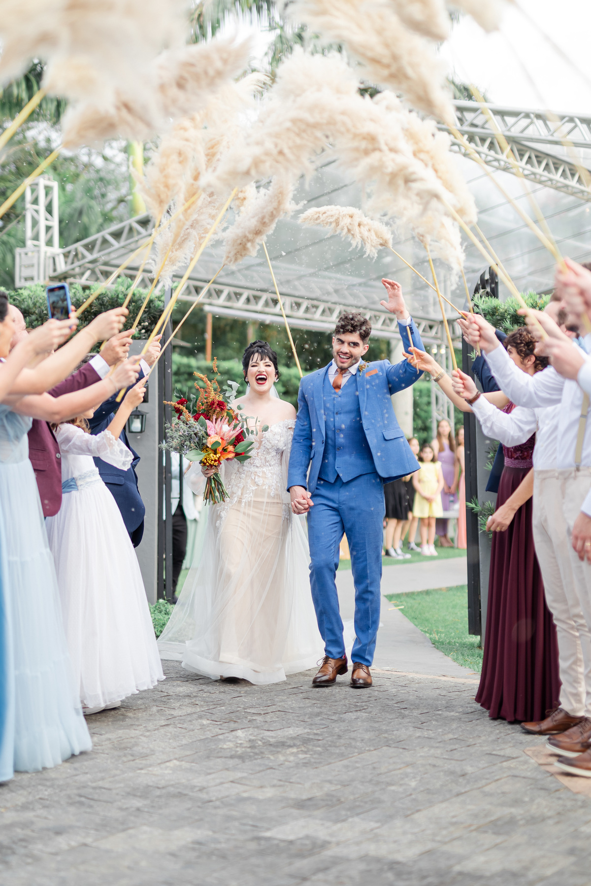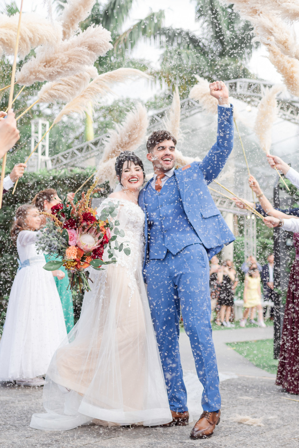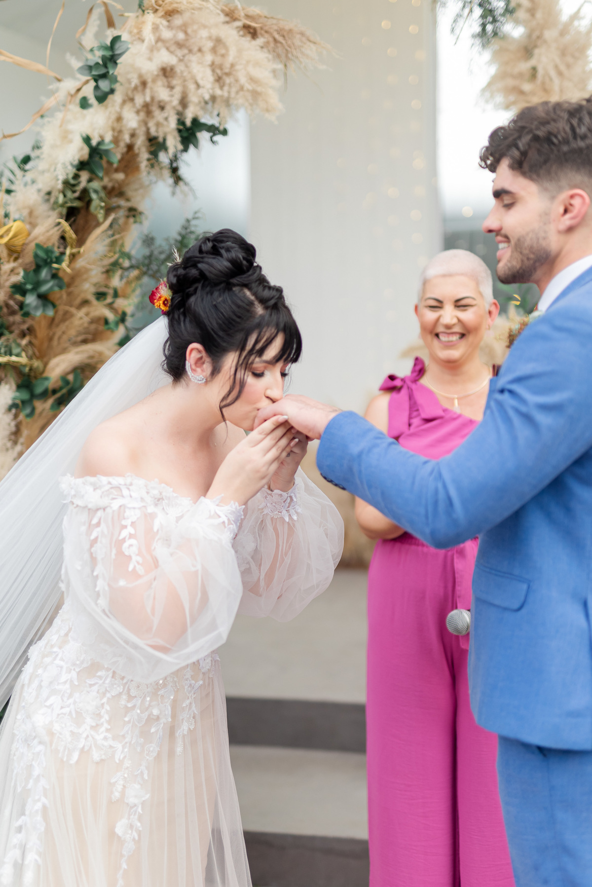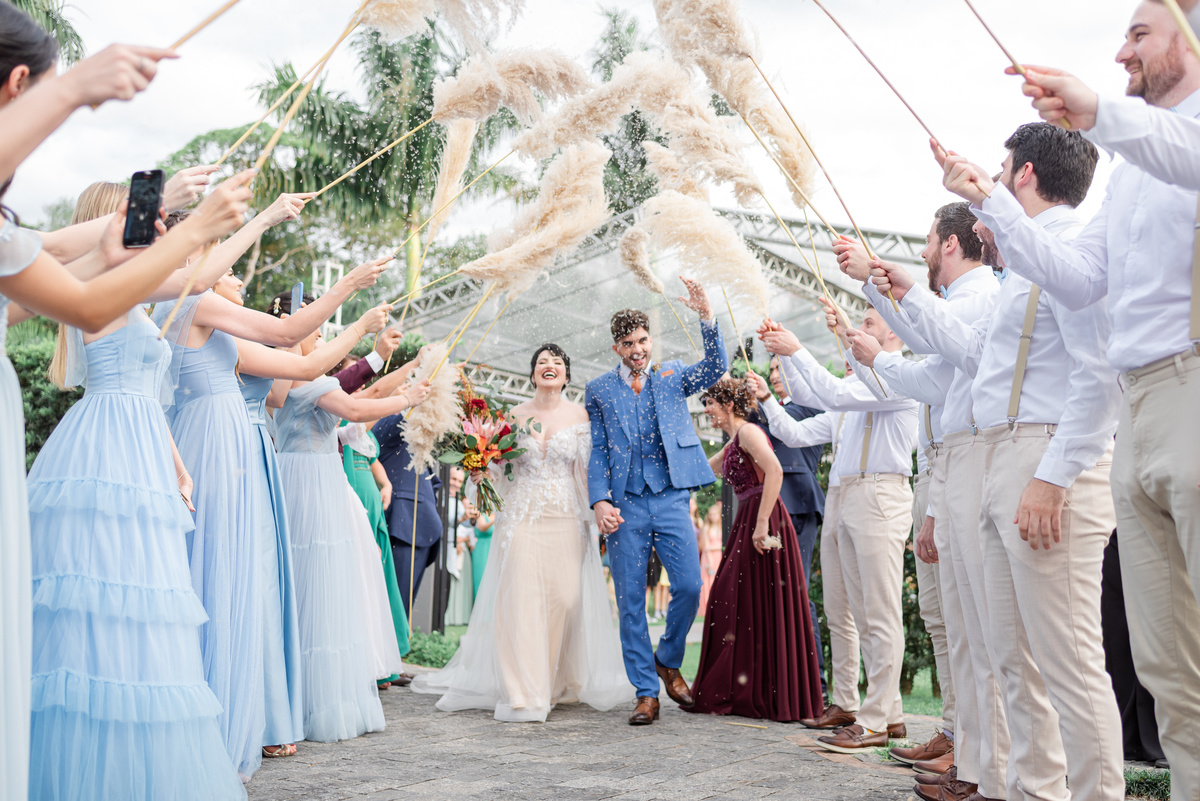 A cerimônia foi linda, aquele chororô nas entradas e nos votos, afinal eles são muito fofos. Teve aliança levada pelo pet do casal, o Lil, que estava de traje combinando com o noivo! Depois chuva de pampas na saída, todo mundo engoliu pluma, mas a foto ficou linda! (Iisso que importa haha)