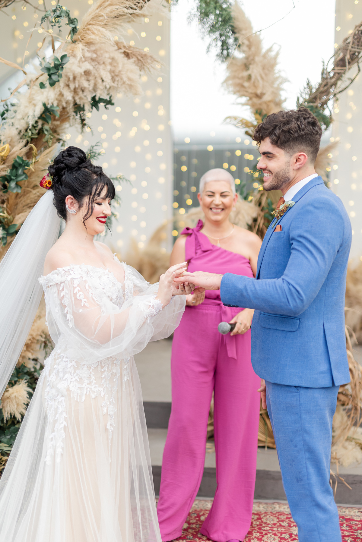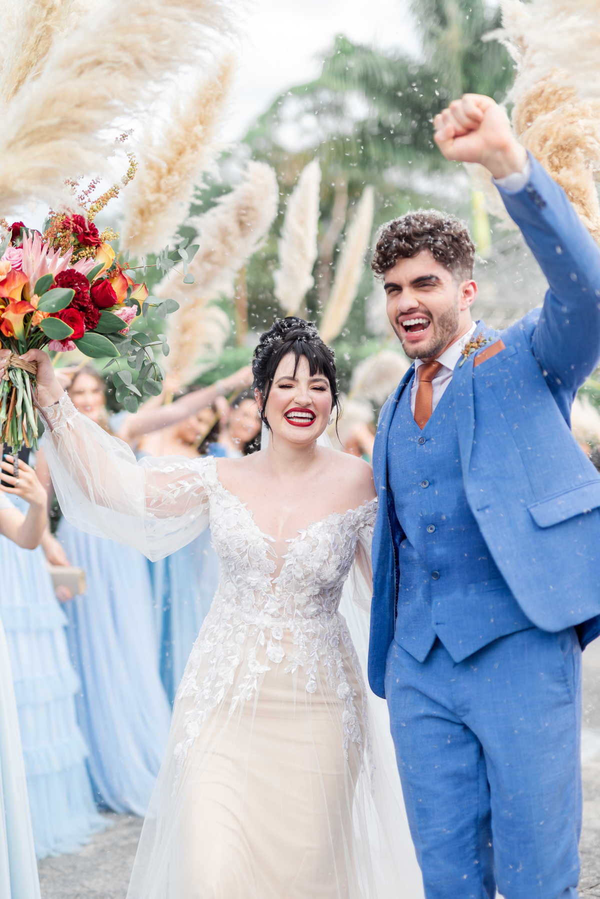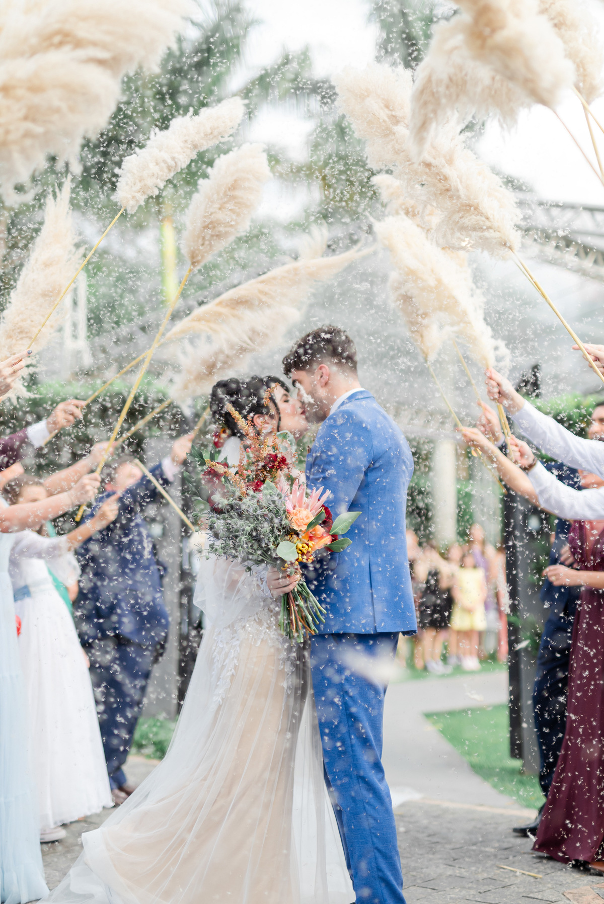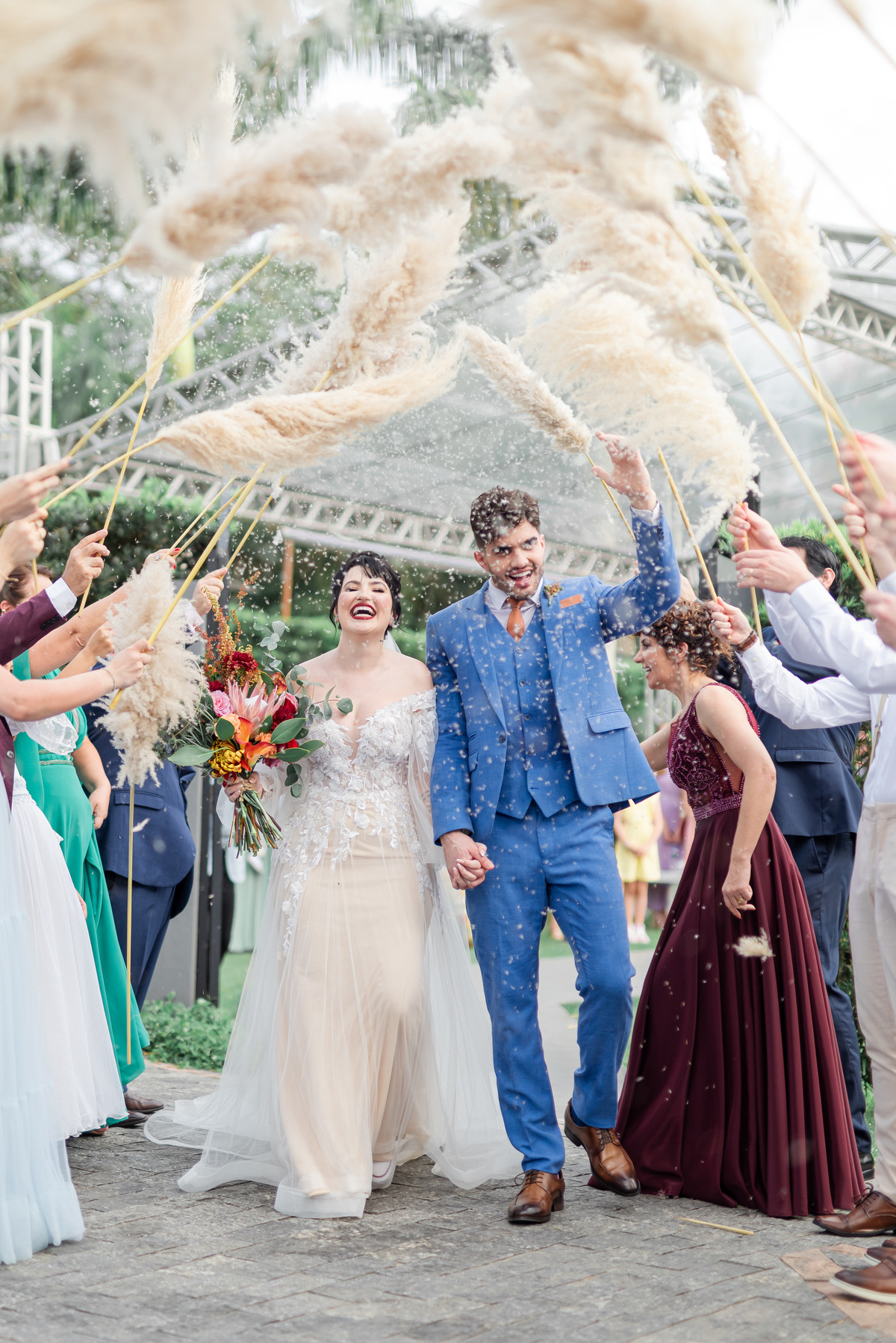 A cerimônia foi linda, aquele chororô nas entradas e nos votos, afinal eles são muito fofos. Teve aliança levada pelo pet do casal, o Lil, que estava de traje combinando com o noivo! Depois chuva de pampas na saída, todo mundo engoliu pluma, mas a foto ficou linda! (Iisso que importa haha)