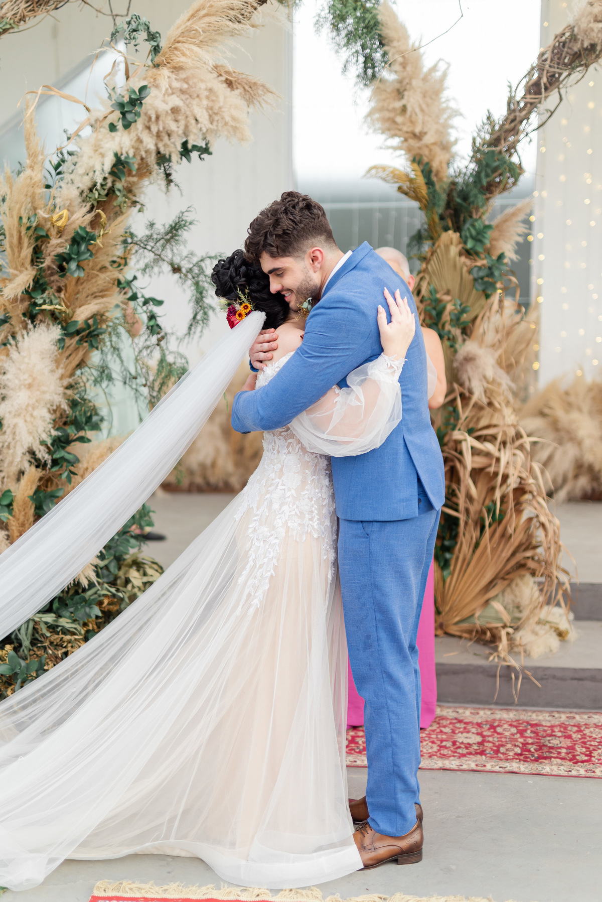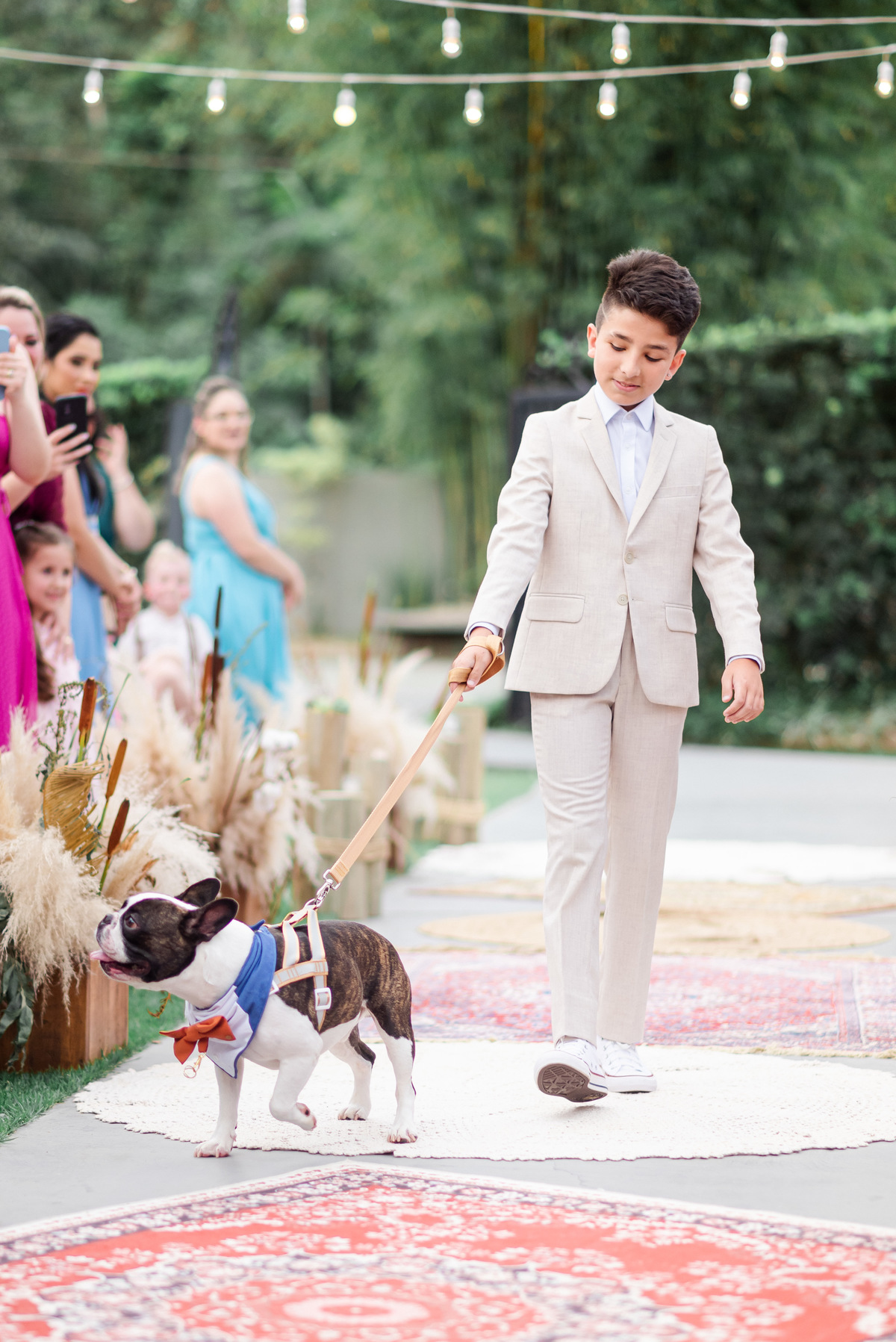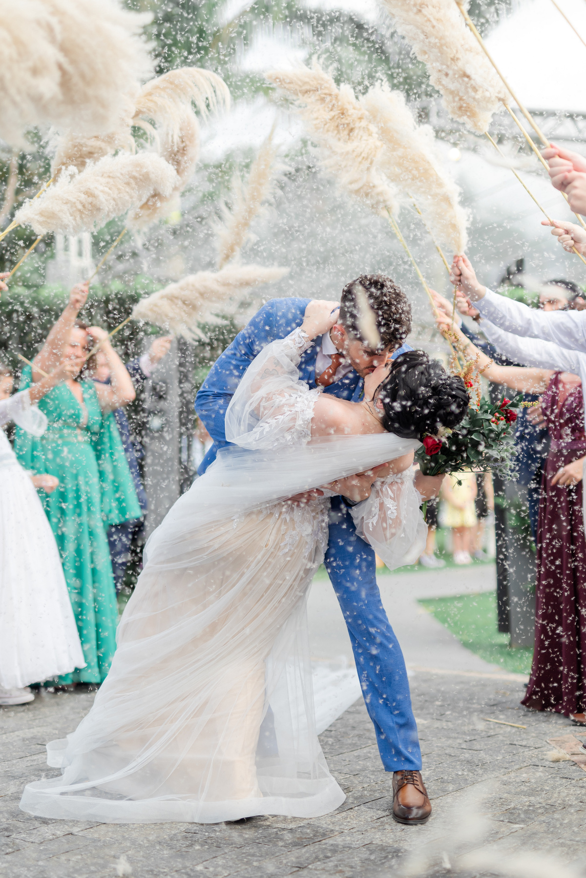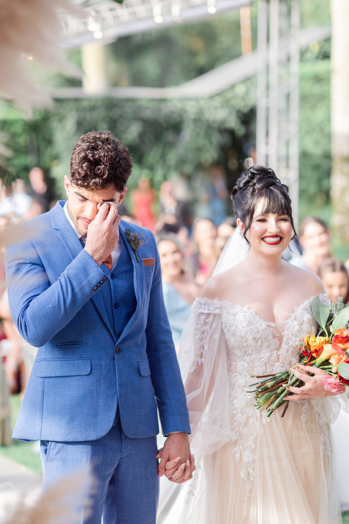 A cerimônia foi linda, aquele chororô nas entradas e nos votos, afinal eles são muito fofos. Teve aliança levada pelo pet do casal, o Lil, que estava de traje combinando com o noivo! Depois chuva de pampas na saída, todo mundo engoliu pluma, mas a foto ficou linda! (Iisso que importa haha)