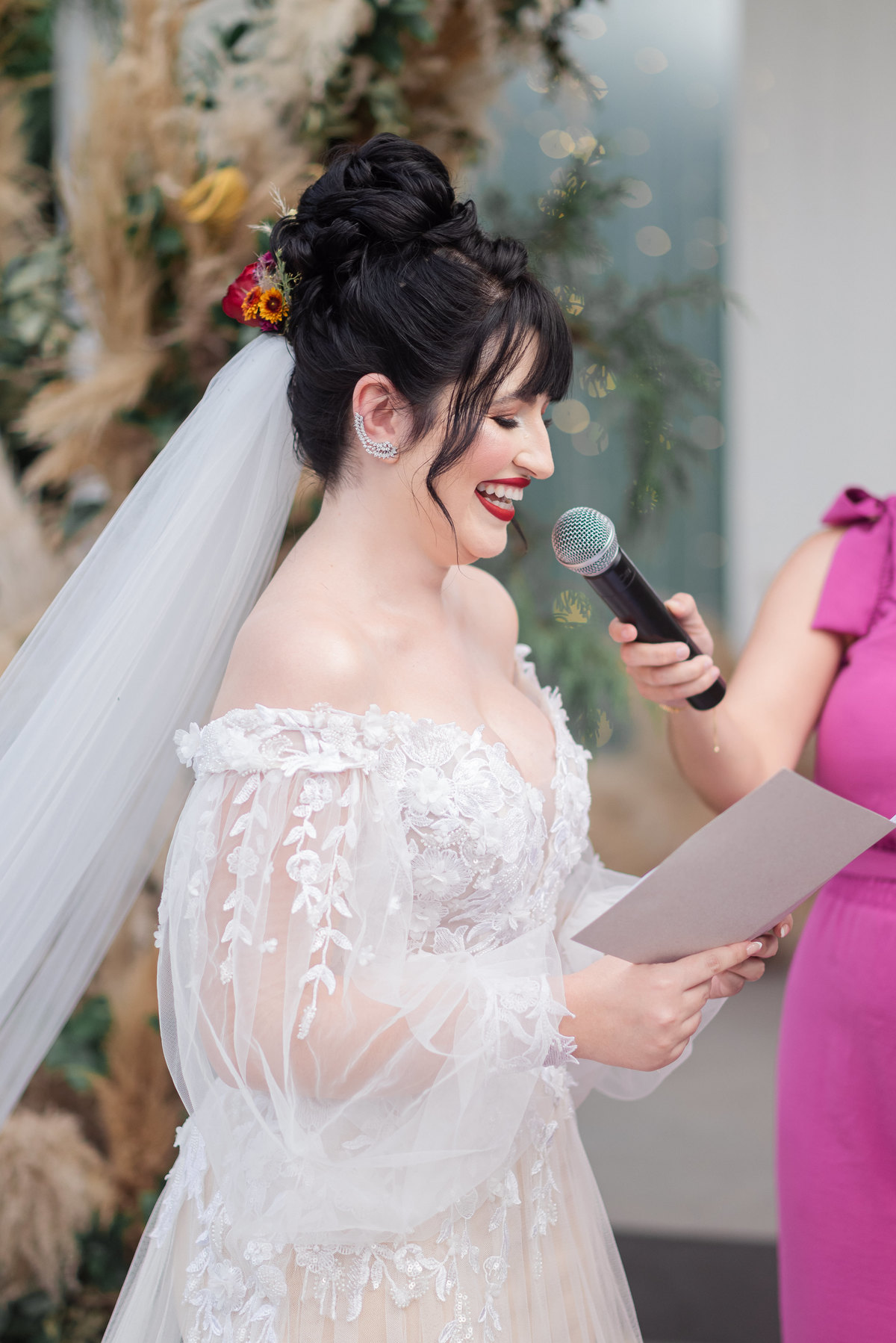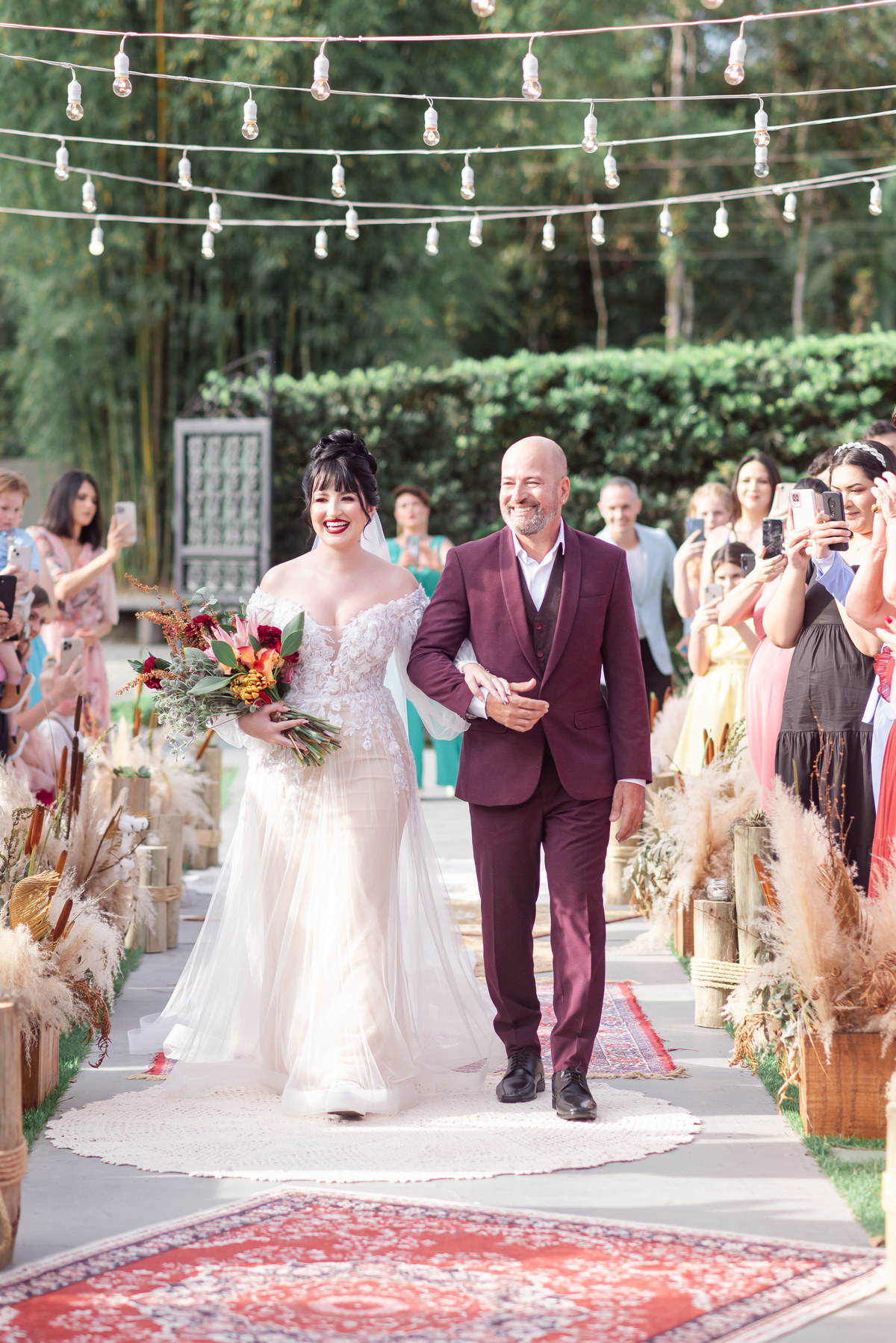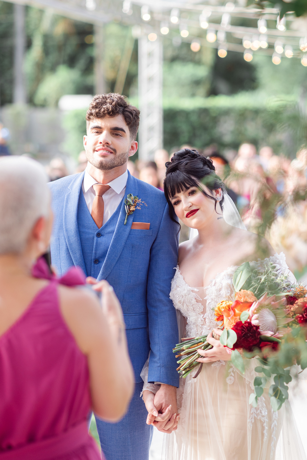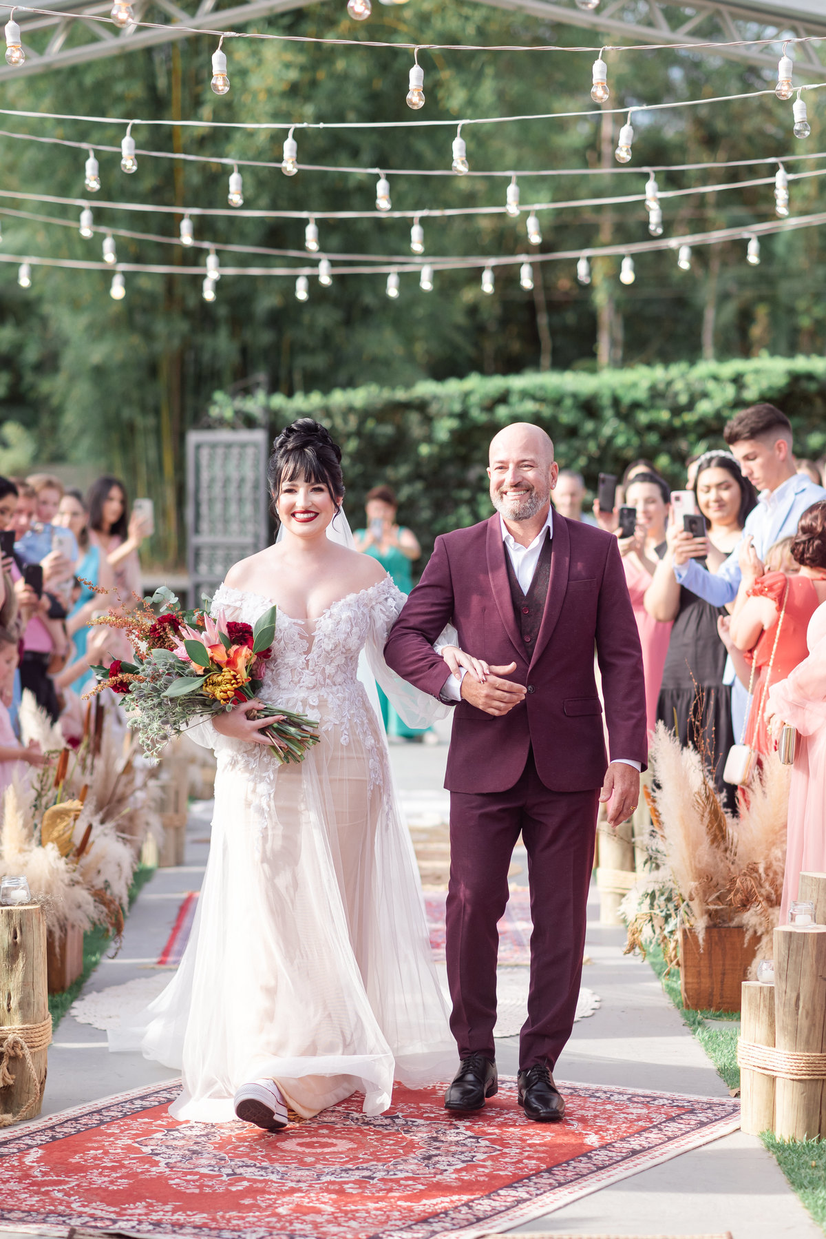 A cerimônia foi linda, aquele chororô nas entradas e nos votos, afinal eles são muito fofos. Teve aliança levada pelo pet do casal, o Lil, que estava de traje combinando com o noivo! Depois chuva de pampas na saída, todo mundo engoliu pluma, mas a foto ficou linda! (Iisso que importa haha)